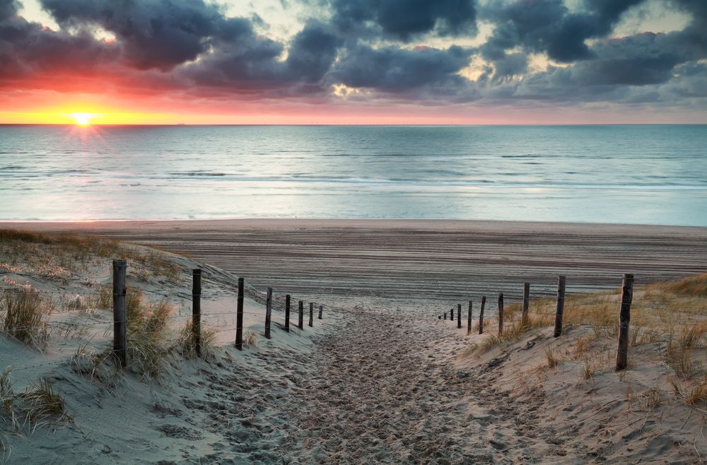 Sand path to North sea beach at sunset